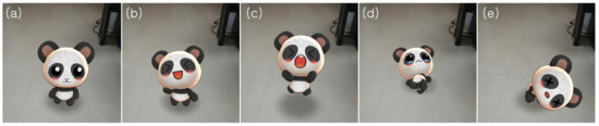 The main AR content used in the experiments showcased a virtual pet (panda) augmented into the real environment exhibiting various interactive and realistic behaviors. The pet possessed 17 user reactive or autonomous behaviors (e.g., greeting, jumping, falling over, and begging for food) with 13 facial expressions (see Figure 2). The pet was augmented, navigated, and acted on the floor (planar surface) detected using the ARCore SDK [53]. To further strengthen its perceived presence [54], a simple physical–virtual interactive behavior was added where the pet could be commanded to approach and turn on/off an actual IoT driven lamp. The panda could be controlled by voice commands.