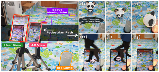 (a) Experimental set-up [7]. (b–d) The sequence of interactions to command the pet to turn on the lamp [7]. (e–g) The situation wherein a pedestrian walks by and intrudes on the augmented reality (AR) scene.