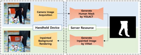 The deep learning-based inpainting [49,50] approach is also quite promising compared to simply relying on multi-view images. Most inpainting algorithms operate offline over the video frames, so that they can refer to and make use of as many frames as possible to find the background and fill in the object mask [51]. VINet [52] is considered one of the state-of-the-art deep learning-based inpainting methods in terms of its computational requirement and accuracy. However, it was not designed for or optimized for small handheld devices. In this work, we used and adapted the work of YOLACT [48] for CIRO segmentation and mask creation, and then used an inpainting algorithm that has been simplified and extended—VINet—to focus on and inpaint for an object that passed through the scene. We ran it on the mobile platform in real-time.