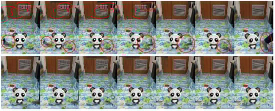 Augmented reality (AR) allows users to see a mixed environment in which virtual objects are inserted into and superimposed on the real environment [1]. Such augmentations are often targeted for predesignated objects that are recognized and tracked by the AR system [2]. However, real environments are dynamic such that new objects may appear and inadvertently interfere with the main content [3,4,5,6]. For instance, the Pokémon Go application overlays the Pokémon character onto the video captured environment, making it appear as if it is standing on the ground, but a passerby can break such an illusion (see Figure 1b). We refer to these real-world objects as content-irrelevant real objects (CIROs). CIROs may distract users from focusing on the AR content and bring about perceptual problems [7,8], such as depth distortion [9,10] and physicality conflict [11]. One way to address this issue is to recognize arbitrary CIROs and even allow natural and plausible physical interactions [12,13] with the main AR content [4,11].