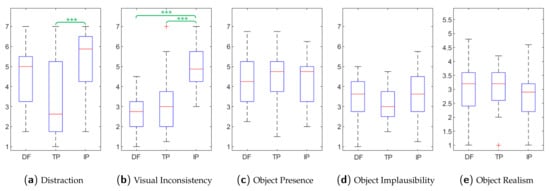 What almost naturally follows from H1 is that subjects would rate the diminished AR content to get the best user experience with the least distraction; perhaps a lesser degree of dual view or visual inconsistency improves physical plausibility, thereby affecting the level of the object’s presence (namely, the main character, the virtual pet), and even its realism. Indeed, Figure 6b shows this very result—TP was ranked higher than DF and IP. Table 4 shows that TP was judged to be the least distracting and to have less visual inconsistency than IP (both with statistical significance), and to exhibit the highest object presence, plausibility, and realism. However, no difference was found between DF and IP in the various evaluation criteria. Thus, even though IP showed good quantitative performance in terms of erasing the CIRO, perceptually, it was still insufficient to eliminate the negative factors of the CIRO (see Figure 5). Subjects have reported that this was much more so when the CIRO stayed within the AR view longer (rather than just passing by quickly). This goes to show the imperfect, not completely artifact-free IP condition caused significant visual discomfort almost as much as not erasing it at all. In our prior study, note that the semi-transparently visualized CIRO had the effect of less distraction and overall improved user experience, but no effect on the visual inconsistency (see Table 1). Similar results were found in [60,61]. Thus we can posit that it is not that the CIRO being noticeable was the problem, but that the visual artifact was aggravating. We conclude that H2 and H3 are partially supported.