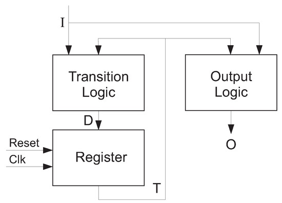 Practically, any digital system includes various sequential blocks [1,2,3]. To specify the behaviour of a sequential block, it is necessary to use some formal model. In many cases, the behaviour of sequential blocks is specified by Mealy finite state machines (FSMs) [4,5,6,7]. Three main characteristics determine the quality of an FSM circuit: the chip area occupied by the circuit, performance (either minimum propagation time or maximum operating frequency), and the consumption of power. These characteristics are strongly interconnected [8]. As a rule, the occupied chip area significantly affects other characteristics of an FSM circuit [9,10]. Various methods of structural decomposition can be used for optimizing the size of the occupied chip area [11]. These methods have one serious drawback: they lead to multi-level FSM circuits with a significant decrease in performance compared with equivalent single-level circuits.