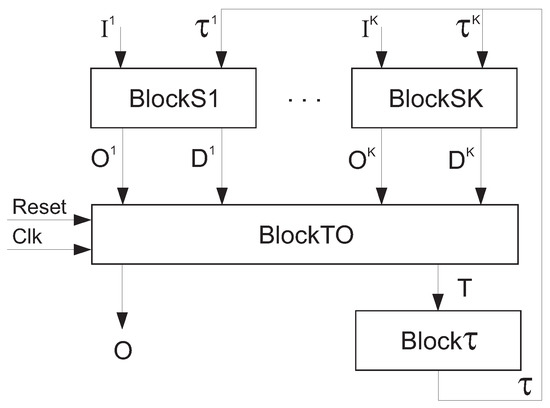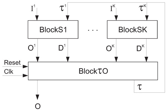 The SBF (2) represents the function of transitions, the SBF (3) represents the function of outputs. Using the terminology from [42], we can state that SBFs (2) and (3) represent a structural diagram of P Mealy FSM (Figure 2).