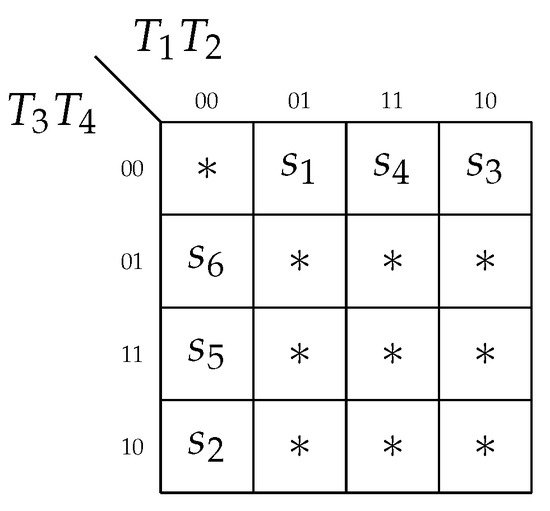 Step 3. The transition from an STT to a DST is executed in the trivial way. The columns , , , , h contain the same symbols in both tables. The state codes are taken from a corresponding Karnaugh map. In the discussed example, the codes are taken from Figure 5. There is a symbol in the row h of the column , if there is 1 in the code of state of transition in this row. In the discussed case, the DST of FSM is represented by Table 2. This table includes rows.