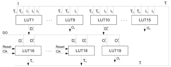 A LUT is a logic block having inputs and a single output [14,21]. A single LUT may implement an arbitrary Boolean function having up to arguments. Unfortunately, the value of is very small [20]. If a Boolean function depends on more than variables, then it is necessary to apply methods of functional decomposition of this function [19,22]. It is known, the applying functional decomposition leads to multi-level FSM circuits with “spaghetti-type” interconnections [23,24].