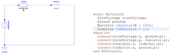 Graphical vs. textual view of the same Modelica model. (left) A simple RL-circuit is modeled using Modelica graphical connection diagrams. (right) Textual view of the RL-circuit Modelica model.
