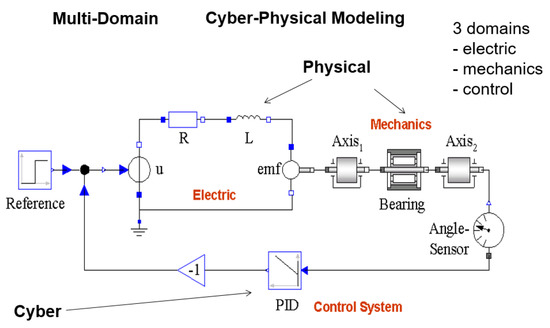 Cyber-physical modeling including multiple domains is illustrated in Figure 3. The model contains parts from three domains, two physical and one cyber: an electric part using components from the Modelica.Electrical library, a mechanical part using components from the Modelica.Mechanical library, and a control (cyber) part using the Modelica.Blocks library.