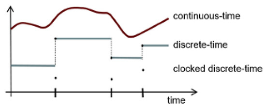 Illustration of hybid modeling in Modelica, allowing combinations of continuous-time, discrete-time, and clocked discrete-time variables.