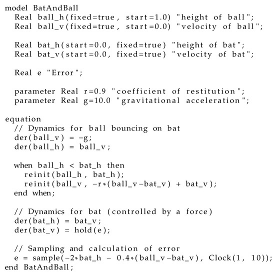 A slightly larger textual Modelica model example is displayed in Figure 5, with the bat-and-ball model. A ball is hit by a racquet causing it to reverse direction via a bounce. This is another example of a hybrid system where the reinit construct causes a discontinuous change of ball movement at the bounce event. A 3D visualization of an advanced ping pong model in Acumen is shown in Figure 8. The results of simulation with the different approaches are compared in Section 3.