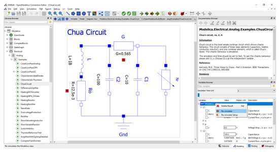 OpenModelica graphical editor OMEdit on a Chua Circuit Modelica model. Upper right: model information pane. Lower right: plot variable control pane.