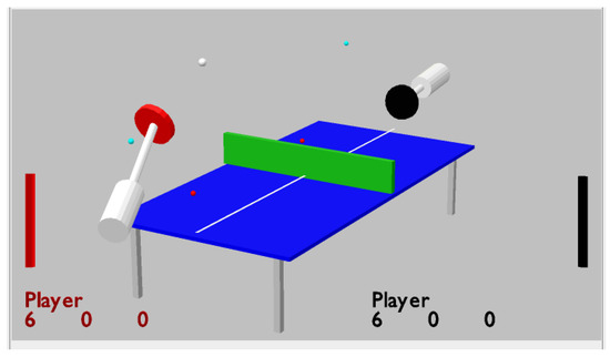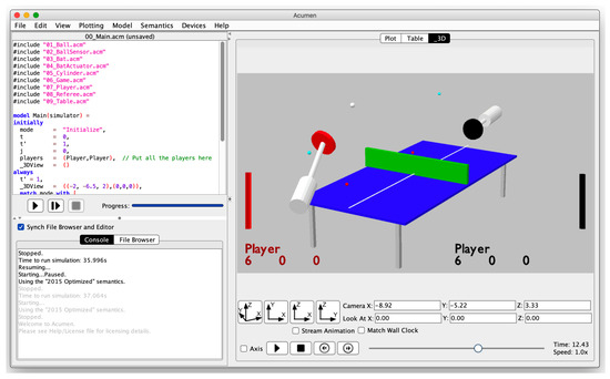 The Acumen environment including 3D visualization of a ping pong playing model.