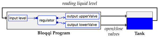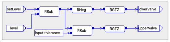 Figure 9 shows a simple example of a Bloqqi program regulating the liquid level of a tank. The program periodically reads the input tank level, and outputs two control signals to open/close the upper/lower valves on the tank. The details of the regulator, a simple on/off controller, are shown in Figure 10.