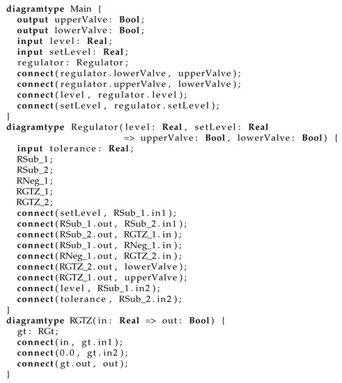 Similar to Modelica, Bloqqi is a textual language with a visual representation. Programs can be edited either visually or as text. Both Figure 9 and Figure 10 are screenshots from the Bloqqi interactive editor. Figure 11 shows the corresponding textual representation of the tank controller program.
