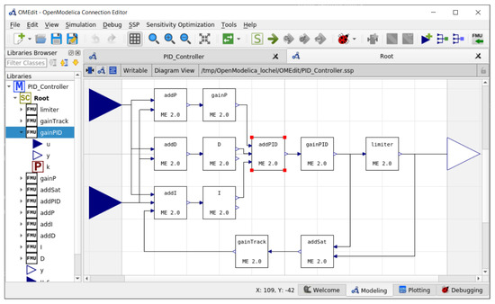 Composite model of a PID controller composed of 11 Functional Mock-up Units (FMUs) connected according to the Structure and System Parameterization (SSP) standard in the OpenModelica OMEdit tool using the OMSimulator subsystem.