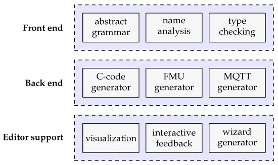 - Broman, D.; Fritzson, P.; Hedin, G.; Åkesson, J. A comparison of two metacompilation approaches to implementing a complex domain-specific language. In Proceedings of the 27th Annual ACM Symposium on Applied Computing-SAC ’12, Trento, Italy, 26–30 March 2012. [Google Scholar] [CrossRef]