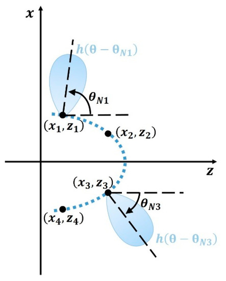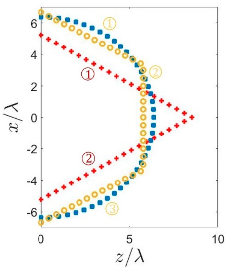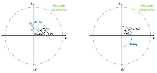 When a semi-circumference array of radius is considered (see Figure 2b), if the elements are uniformly distributed in angle, the -th element is individualized by the angle belonging to , with . Accordingly, , whereas the focusing direction of each element is .