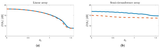 Let us consider the simple example of an array with rectilinear or semi-circumference support of length , and isotropic elements uniformly distributed. Then, the effectiveness of the upper-bound (4) is tested for both the geometries by comparing it with (10) and (11): in Figure 3, indeed, it is shown that the directivities values relative to the field produced by (8) (dashed red line) when changing the focusing angle are always less than or equal to the upper-bound (blue line), which represents the directivity value due to the field (6). In particular, when the linear array is considered (Figure 3a), the two curves almost overlap, meaning that the field due to (8) can be expanded as in (6), i.e., element excitations (9) provide the maximum directivity in a wide angular range.