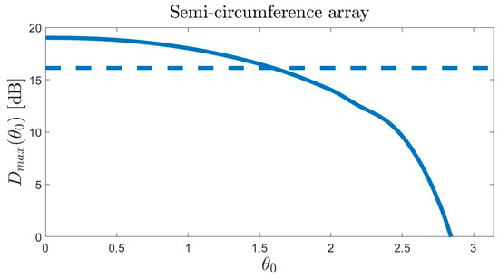 The behavior in dB of the maximum directivity of the semi-circumference array (solid blue line) in Figure 4. The dashed line represents the corresponding value of .