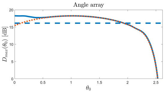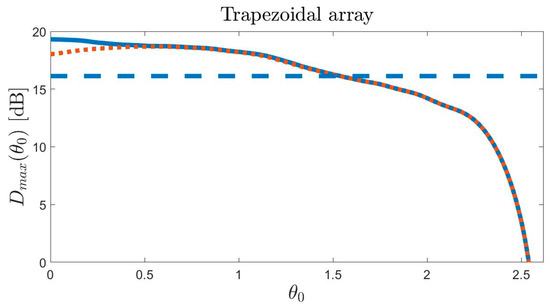 The behavior of the maximum directivity of the trapezoidal array (solid blue line) in Figure 4 and its corresponding value of (dashed blue line). The dotted red line represents the maximum directivity due to the only upper angle array forming the source, which specularly acts with respect to the lower angle array.