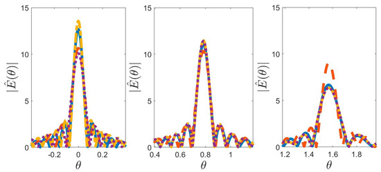 The amplitude of the field radiated by the semi-circumference array (solid blue lines), the trapezoidal array (dash-dotted yellow lines), the sides 1–2 of the trapezoidal array (dotted violet line), and the angle array (dashed red lines) of Figure 4. The plots present the field amplitudes for the choice . From left to right, the three panels refer to the focusing angles , respectively.