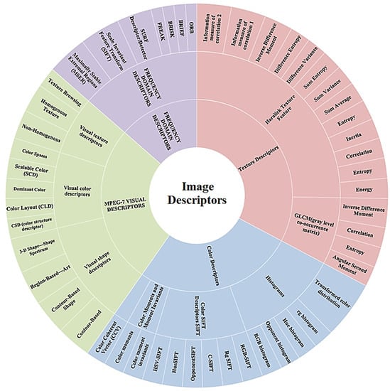 The following Figure 1 shows most of the image descriptors stated in the literature [17]. The inner-circle represents the type of descriptors, while the middle circle represents the different descriptors. Moreover, the outer circle represents the features used by each descriptor. However, this paper experiments with different features on a dataset of faces, and specific descriptors that cover most of the previously mentioned features are selected. The selected descriptors are briefly described in the following paragraphs: