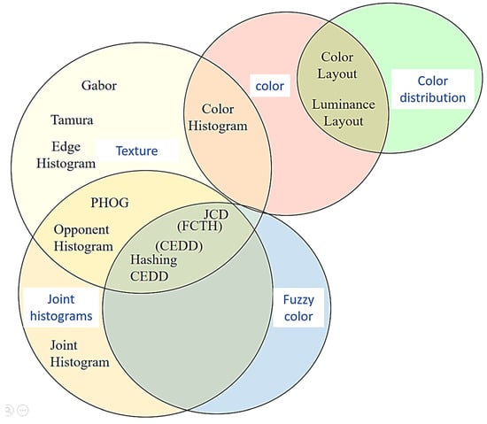 The descriptors used in this paper are summarized in Figure 4. As can be seen in Figure 4, the descriptors are categorized based on the existing features. One can notice that the Texture feature and Joint Histogram involve most of the descriptors. The joints in Figure 4 show the common image features between the descriptors. Therefore, these descriptors are carefully selected to represent all of the images’ features reported in the literature.
