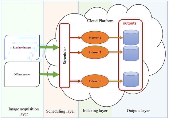 The parallel indexer consists of four layers, including the Image Acquisition, Scheduler, Indexer, and Output layers. The Input layer contains runtime image processing and offline image processing. Runtime image processing is used for runtime applications, and it requires certain management and handling where time is critical. On the other hand, offline image processing is another component that is used when no critical image handling is required. Current image processing techniques typically use small image files in sequential processing units, which severely limits the processing capacity and even results in failure once the cluster fails to timely handle these huge amounts of small image files. The input layer is used to remove the repeated images and change their format to a suitable indexer format to resolve these limitations.
