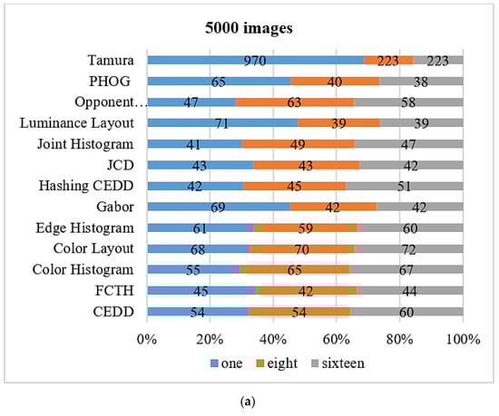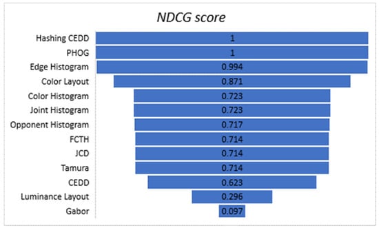 Here, the rank is classified into four categories (2, 1, 0, –1) according to the relativity to the image retrieval with ranges of 1–1000–1001–5000, 5001–10,000, and 10,001–end, respectively. Again, the results are conducted on the average results gained from all the images retrieval statistics. NDCG@k is implemented in Python and run over the retrieval average results. The same results have been confirmed using NDCG@k as shown in Figure 24. This figure ranks the descriptors based on their retrieval quality.