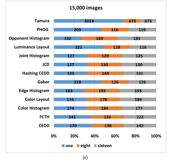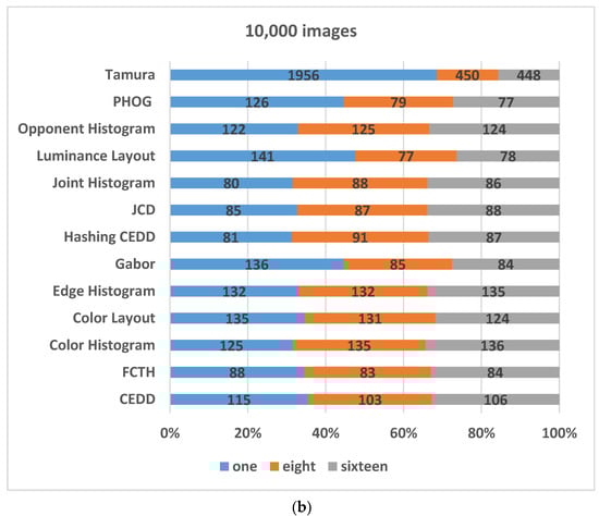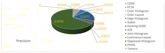 Here, another way to rank the descriptors according to image retrieving performance using the average precision@K is shown. Out of the number of images, k is set to 10,000. Figure 23 shows the precision@10,000 for all the used descriptors. As can be seen, on average, the PHOG has the best precsion@10,000 followed by Hashing CEDD, where they locate the images early with a relatively high score. Other descriptors vary in their measures based on the image position in the retrieval process. However, it is recommended to consider each descriptor separately along with each type of image to be retrieved.
