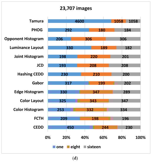 Edge Histogram Descriptor [34]: The Edge Histogram function is part of the standard MPEG-7, a multimedia meta-data specification that includes many visual information retrieval features. The function of the Edge Histogram captures the spatial distribution within an image of (undirected) edges. Next, the image is divided into 16 blocks of equal size, which are not overlapping. The data are then processed for each block edge and positioned in a 5-bin histogram counting edge in the following categories: vertical, horizontal, 35mm, 135 mm, and non-directional. This function is mostly robust against scaling.