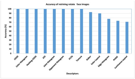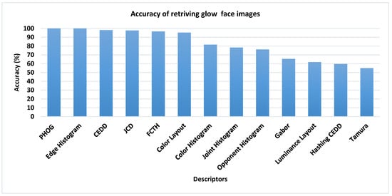 The glow filter is considered one of the important filters in many applications. To examine the retrieval performance with different descriptors, there are different experiments conducted on the selected images with the glow filter. Here, as can be seen in Figure 19, only two descriptors achieved 100% accuracy, PHOG and Edge Histogram. As shown in Table 8, PHOG is retrieved with a high score of 1359, which is larger than the Edge Histogram score of 72. Other descriptors’ accuracy could be divided into two categories; the first category accuracy is within 85% and 98%, and the other category is between 55% and 80%. Thus, for glow images, it is recommended to use the Edge Histogram.