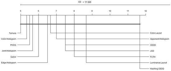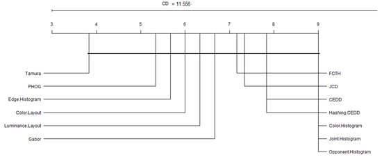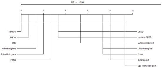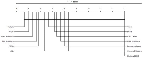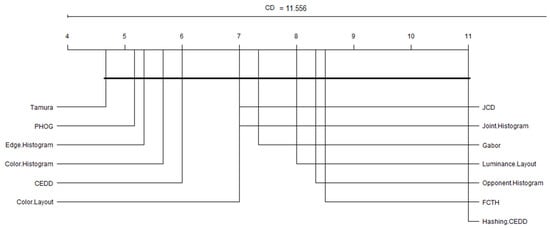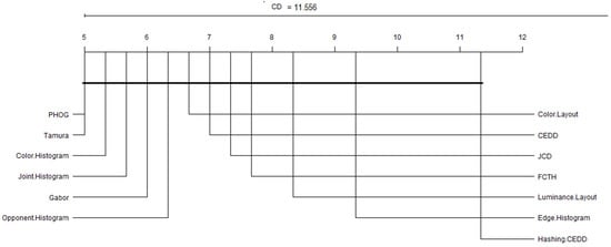 Another descriptor classification is shown in Figure 16, where the Critical Distance Diagram (CDD) is drawn. It has been noticed that the distance between the descriptors are almost equal, which indicates the gradual performance of the descriptors.