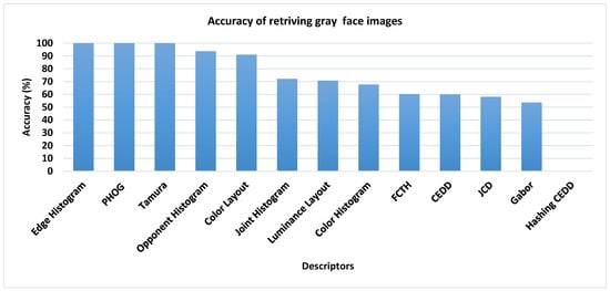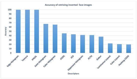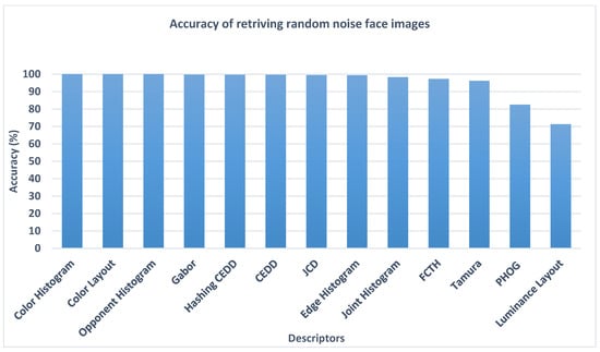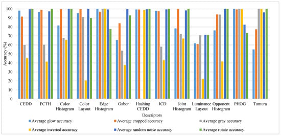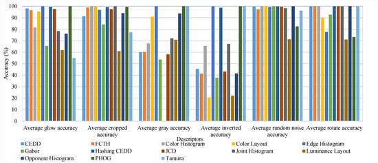 As shown in Figure 21, the accuracy of all descriptors, except the Luminance, performs well with the random noise, cropped, and rotated images. Another observation that can be seen is that most of the descriptors fall behind in the retrieval performance in the case of gray and inverted images.