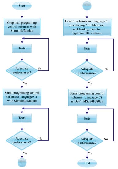The six variable speed strategies described above were simulated in MATLAB SIMULINK and Virtual HIL Device (a software-based emulator of the Typhoon HIL 402 real-time device). Numerical implementations were carried out in three stages. Initially, each controller was implemented by using standard SIMULINK Simscape Electrical libraries and standard block functions.