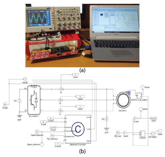 16], a comparison of FOC, DTC, predictive torque control (PTC) and predictive current control (PCC) was experimentally performed in 2.2 kW squirrel-cage IM. The IM was driven by a modified SERVOSTAR620 14 kVA inverter (Radford, VT, USA) and controlled by a 1.4 GHz real-time controller, which provided full control of the IGBT gates. The authors concluded that overall the strategies had good functioning in the entire speed range with or without load. However, the implementation of different control strategies in a Field-Programmable Gate Array (FPGA), digital signal processor (DSP) or advanced microcontroller was lacking, which limits the overall conclusions. Different control and optimization techniques for IM were reviewed by Hannan et al. [