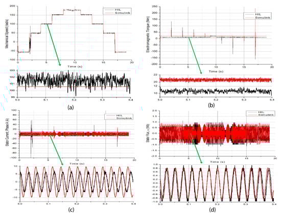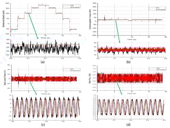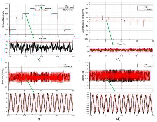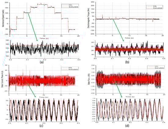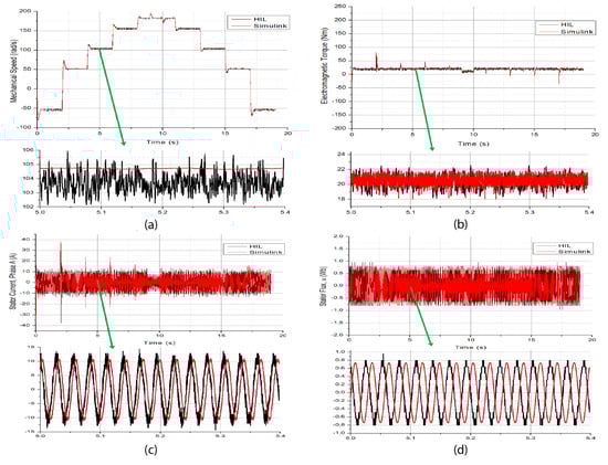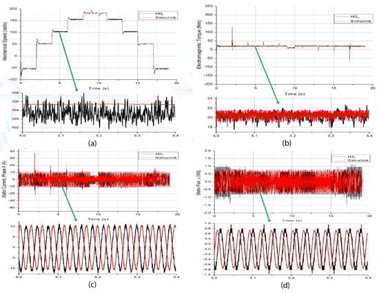 Figure 9c,d shows the stator current phase A and stator flux, respectively. A poor agreement between both platforms can be noticed. Indeed, the current in steady state is bigger in the SIMULINK compared to the DS-HIL response, with a slight time delay caused by the sampling and DSP processing time.