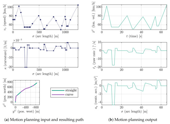 where (0.1 m) is a suitable step size and . Equations (43)–(50) are then numerically calculated for the resulting arc length series. The output of the planner accordingly is