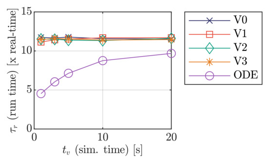 Numerous efficient simulation approaches have been developed for other time-critical applications such as computer graphics as well. In most cases, computer graphics functions require real-time performance for visualization, which means that the time available for the simulation of dynamic systems can often fall below even 1 ms. Position-Based Dynamics (PBD) directly computes the position-like dynamical quantities instead of time integration of equations of motions derived from Newton’s second law [12,13]. Subspace simulation methods are used to reduce the complexity of dynamic models by projecting the equations of motion into a reduced subspace with the help of, e.g., Principal Component Analysis (PCA) for a more efficient solution [14,15]. Data-driven physical simulations use data precomputed offline by accurate dynamic simulation techniques to approximate and/or accelerate online simulations. Artificial neural network-based data-driven models are an attractive opportunity for time-critical simulations because they enable faster run-times at the price of offline pre-calculations and higher memory usage [16,17]. Researchers at Ubisoft and McGill University are combining subspace simulation techniques with supervised learning in a computer graphics application where the computation time available for one object is in the range of 10–100 microseconds to simulate deformation effects, collisions of objects, and external forces [18].