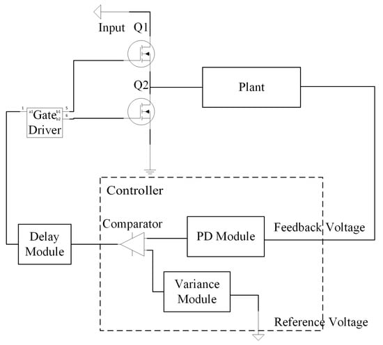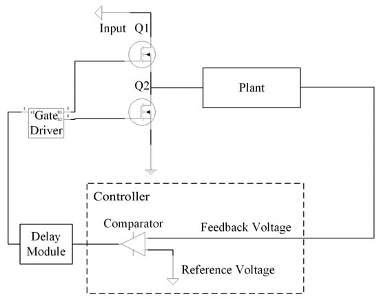 Thus, it can be concluded that the steady-state frequency of the hysteresis voltage mode is determined by the control parameter ratio, equivalent serial resistance (ESR) of the capacitance and the half hysteresis width. A high ratio and low resistance lead to a small width and high frequency, which is unreasonable. To simplify the design process, a control mode with only one logical judgment point (a singularity point for a control dynamical system) should be adopted; in contrast, the hybrid hysteresis voltage proposed in [] has two points of this kind. The constant on-time (COT) voltage mode is confirmed to be such a kind of controlling mode, which is designed for light-load applications to achieve high efficiency and a fast transient response. The basic COT voltage workflow is demonstrated by Algorithm 1. In Algorithm 1, U_transistor represents the status of the upper transistor and L_transistor represents the status of the lower transistor. The number 1 means on, and 0 means off. The system is initialized at the beginning of the process and then starts to work. By comparing the feedback voltage with the reference voltage, the status of the transistors switches. Thus, it is a nonlinear control method. The block diagram of Algorithm 1 is presented in Figure 1. In the diagram, the Delay module is implemented after the compensator, with t_on being a fixed value and t_off being a minimal value.