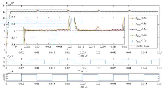 Considering Figure 5 and taking the red dot line ( μs) as an example, the static differences almost disappear when the system works in a steady state. The output voltage matches the set value well. The transient time is short, and the overshoot is repressed well. The model even copes well with a sudden change: the system can recover to a steady state quickly and the surge is acceptable. The other lines (different delays) follow the same rule.