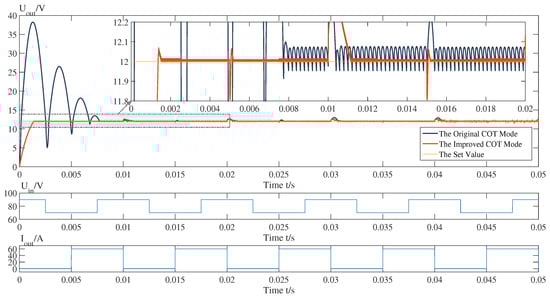 It can be seen from Figure 3 that the output voltage (dark blue dotted line) vibrates around the set value with the evolution of time and is insensitive to the sudden changes of the inputs. The amplitude is acceptable in steady state and the transient time is reasonable. This means the COT control also has strong robustness. However, its large start-up overshoot amplitude and high steady-state peak-to-peak voltage are unacceptable, and the circuit is not in the proper steady state, because the output frequency is lower than the designed frequency. The COT voltage mode has two kinds of steady states, while the controller only works with an alternating frequency between the highest frequency and zero in the abnormal steady state.