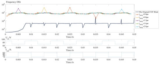 Working with a designed and fixed operating frequency under CCM is the main advantage of the COT mode compared with the hysteresis mode. In this study, the variation of the operating frequency is focused not only when the system is working in a steady state but also when the system suffers a sudden change of load. The operating frequencies of the COT and PD-COT with different delays are simulated, and the results are shown in Figure 7.