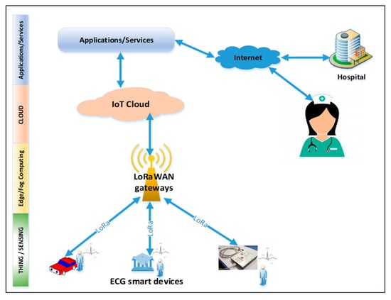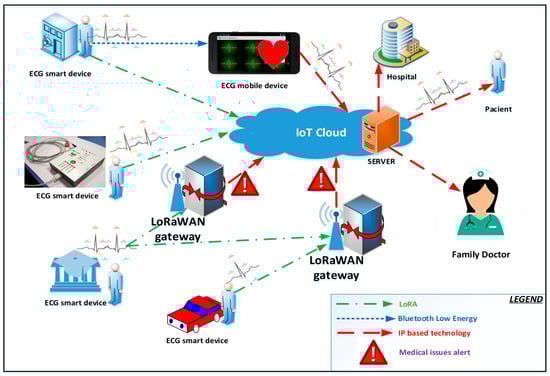 In [23,28], the authors have proposed a solution for an Internet of m-health things system for remote ECG monitoring. The device allows connection to a central server through the USB, Bluetooth, and GSM interfaces, but this article proposes a new and efficient solution based on LoRa. However, the applicability of the system proposed in [23] can be improved, by integrating the concept into a new perspective of data acquisition and communication such as LoRa technology, which will be the scope of this paper. Nowadays, there are developed and used new efficient technologies having as the main concern the power efficiency and transmission of data at long distances, named LPWANs.