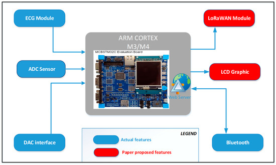 The general hardware architecture of the medical experimental device is proposed in Figure 3, and it is designed and developed around an ARM Cortex M3 microcontroller to which different sensors and communication interfaces are connected. The ADC (Analog-to-digital converter) Sensor and DAC (Digital-to-analog converter) interface are the acquisition sensors of the ECG system that can transmit analog values or use built-in DAC converters to convert the measured analog value to a digital one and transmit the final value to the acquisition board. This way, the signal immunity for the ECG signal obtained from the human body is much precise, and the obtained values are much accurate to be processed. DAC sensor could be the ADAS1000 ECG IC, which has built-in ADC’s and transmits the final ECG digital signal to the MCU in order to be processed.