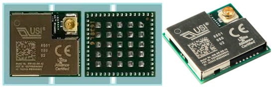We use LoRaWAN gateways placed in key-points and develop the coverage area to perform the best possible communication between the devices. USI® WM-SG-SM-42 low-power long-range LoRaWAN® module (see Figure 4), based on the STMicro STM32L0 series ARM Cortex M0 + 32 bit microcontroller (MCU) and Semtech SX1272 ultra-long-range wireless transceiver, is a low power wide area network (LPWAN) wireless module that supports the LoRaWAN long-range wireless protocol.
