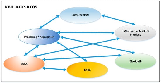 From the software point of view, this device is developed with the help of a real-time operating system (RTOS) for modularization and efficient control of the response times. The Keil RTX 5 RTOS is used for development. The application on the microcontroller is divided into 6 tasks, each task having a unique priority. The tasks, in descending order of priority, are LoRa, Bluetooth Acquisition, Processing/Aggregation, Logs, and HMI. These tasks use the inter-task communication mechanism provided by RTOS to cooperate through synchronizations and data exchange.