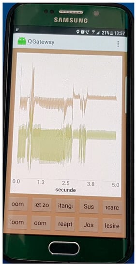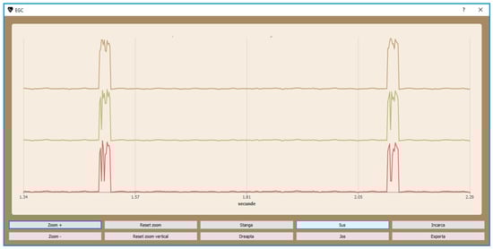 Patients can view acquired data after receiving the ECG signal. This can be done from a PC or a smartphone. Figure 6 shows how to view an ECG capture on a PC, and Figure 7 shows the view from a smartphone. The data can be downloaded and saved on the flashcard that was inserted into the PC, on the smartphone, or by connecting via Bluetooth to the device. After viewing, the patient can agree that the data be transmitted to the central server via LoRa. As can be seen from Figure 6 and Figure 7, the ECG capture is not very good in quality because it is made at home but may indicate whether it is necessary to call the patients to the doctor’s office for a more detailed consultation with professional devices.