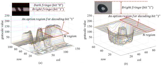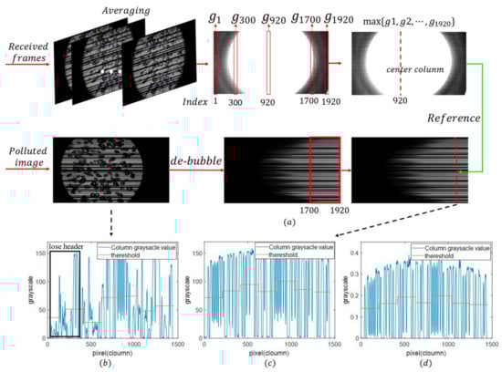 Figure 1b shows the effect of underwater bubbles on the fringes captured by the CMOS sensor in the experiment. It is obvious that the existence of these bubbles seriously affects the contrast of the original dark and bright stripes captured by the CMOS sensor, which will undoubtedly reduce the accuracy of the signal decoding. Notice that the entire pixel line is not completely contaminated by bubbles; hence, a method based on row pixel sorting to eliminate the effect of bubbles on stripes is used. First, we sort elements of each row matrix of grayscale values in a raw grayscale image frame polluted by bubbles in ascending order. The shadow generated by bubbles will be moved to the left of the image, and the pixels in this line that are not disturbed by bubbles will be moved to the right of the image. It is worth mentioning that the selection of vertical column in the sorted image may lead to the elements in the column matrix coming from all parts of the original image, making the pixel values of the same data bit “1” fluctuate greatly. Considering this problem, a reasonable column matrix (we marked it as ) is determined by the following method.