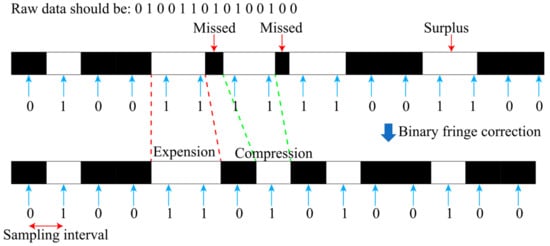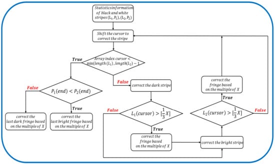 To solve this situation, a binary fringe correction (BFC) method is proposed in this paper; the flow chart is shown in Figure 3. Firstly, linear interpolation is used to make the fringe width of one bit be odd and recorded as X. After thresholding, a binary sequence containing only 0 or 1 is obtained. Then, according to the statistics of the black and white stripes, the arrays and (containing the length elements of the black and white stripes, respectively), and the arrays and (containing the starting position elements of the black and white stripes, respectively) are obtained. One case is that the first element of is less than that of the corresponding position of , which means that the dark stripe will be recovered preferentially. Then fringe correction is executed, which is done by increasing the index “cursor” in the array . The next step is to check the length of the dark fringe. When the fringe length of the corresponding position of “cursor” or is less than , it is considered to be caused by noise that can be neglected, where is a rounding symbol (for example = 5, = 3). In this case, the next corresponding bright stripe will be restored. Otherwise, the fringe will be corrected based on the multiple of X and the recovery of dark and bright stripes is done alternately. For instance, if the number of pixel rows occupied by a bit is 9 after interpolation, a black stripe of length 7 will be corrected to 9, the next white stripe of length 38 will be corrected to 36, and so on.