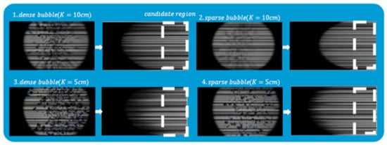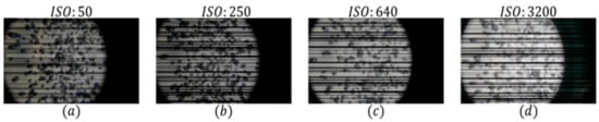 Furthermore, we also discussed the state of bubbles in different ISOs. We fixed the position of the air pump and kept the bubble density and unchanged (= 5). Four different ISOs (50, 250, 640, and 3200) were set to observe the effect of bubbles and stripes (as shown in Figure 9). Obviously, the bubbles did not disappear when the ISO was changed. Therefore, in this case, the ISO needed to be selected according to the quality of fringes rather than bubbles. We found that when the ISO was low, the camera’s sensitivity to light became weaker, resulting in serious blurring of bubbles and stripes. As the ISO increased, the camera sensed more light in the same exposure time, which led to a decrease in the contrast of dark and bright stripes in the image. After synthesizing the analysis and the discussion above, an ISO of 250 was selected to obtain the best image definition and contrast in this experiment.